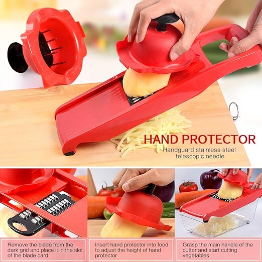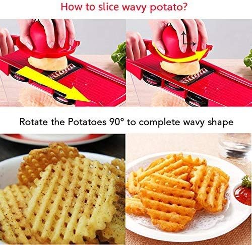 【Cortador de verduras multifuncional】: incluye 6 tipos de cuchillas reemplazables al azar, trituración, rodajas de flores, pasta para cortar, diferentes cuchillas pueden cortar fácilmente verduras, cebollas, cortarlas en tiras y rebanarlas en diferentes estilos.【Material seguro y duradero】: ABS de calidad alimentaria, puede sentirse cómodo con los ingredientes, comer cómodamente, llevar protectores de manos, manos y cuchillas sin contacto, verdaderamente seguro, decir adiós a las lesiones, brindarle tranquilidad. , tranquilidad de espíritu【Ahorre tiempo de cocción】: el cortador de verduras multifuncional es perfecto para que las amas de casa ocupadas preparen comidas. Adecuado para cocinar en casa, cortar tomates, pimientos, zanahorias, frutas, remolachas, pepinos, cebollas, patatas y queso, etc. Especialmente práctico para la limpieza de almacenes.【Fácil de desmontar y limpiar】: Cada pieza se puede desmontar y limpiar, la hoja se puede limpiar con agua, no hay necesidad de preocuparse por las manchas rebeldes, lavado con agua de todo el cuerpo, limpieza más conveniente【Regalo perfecto y necesidad para la cocina moderna】. El cortador de verduras multifuncional viene en una caja sencilla y atmosférica, perfecta como regalo de boda, regalo de vacaciones o nuevo regalo familiar, un regalo de ocasión especial para sorprender a sus queridos amigos y familiares. Si tiene alguna pregunta sobre el cortador de verduras, no dude en enviar un mensaje al vendedor a través de Amazon.